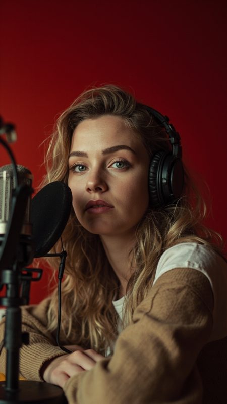 A realistic medium shot, waist-up view photo taken from a slight distance, clearly showing the environment and background. A woman sits at a podcast desk, with a large condenser microphone in front of her (not blocking her face), and wearing over-ear headphones. She is looking diagonally toward her guest, not at the camera, as if mid-interview. Her arms rest casually on the table. The room has a distinctive red wall in the background, clearly visible and well-lit. Lighting is natural and imperfect, as from a smartphone camera indoors, with soft shadows, slight noise or grain, and realistic ambient lighting. Her face shows natural beauty with human details: visible pores, light imperfections, subtle makeup that is not flawless, soft eye shadows, natural lips, asymmetry in facial features, slightly messy hair. The microphone arm, desk, and podcast setting are included in the frame. No close-up, no artificial airbrushing, no CGI — the image must feel human, authentic, and taken in a real environment. Focus on natural skin texture, mood, and photographic realism. –ar 9:16 –style raw –quality 2 –v 6 –realism high –style photographic –no closeup –no portrait