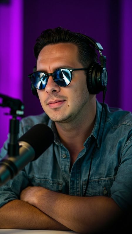 A realistic medium shot, waist-up view photo taken from a slight distance, clearly showing the environment and background. a man sits at a podcast desk, with a large condenser microphone in front of her (not blocking her face), and wearing over-ear headphones. he is looking diagonally toward her guest, not at the camera, as if mid-interview. Her arms rest casually on the table. The room has a distinctive purple wall in the background, clearly visible and well-lit. Lighting is natural and imperfect, as from a smartphone camera indoors, with soft shadows, slight noise or grain, and realistic ambient lighting. Her face shows natural beauty with human details: visible pores, light imperfections, subtle makeup that is not flawless, soft eye shadows, natural lips, asymmetry in facial features, slightly messy hair. The microphone arm, desk, and podcast setting are included in the frame. No close-up, no artificial airbrushing, no CGI — the image must feel human, authentic, and taken in a real environment. Focus on natural skin texture, mood, and photographic realism. –ar 9:16 –style raw –quality 2 –v 6 –realism high –style photographic –no closeup –no portrait